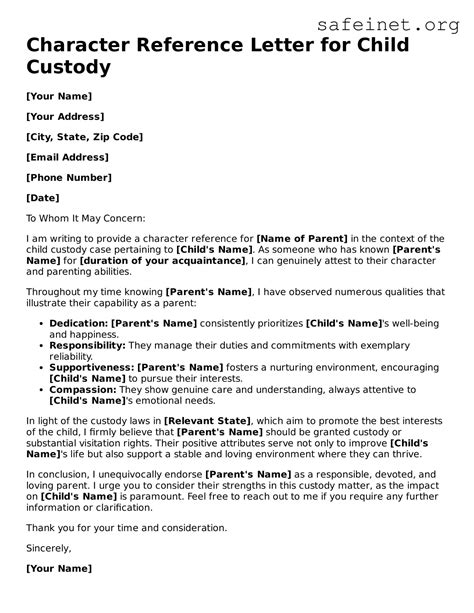 Child Custody Character Reference Letter Samples - Character reference letter for child custody: Providing specific examples of a parent’s fitness in a written character reference letter can make a real difference in the outcome of a child custody case. Given below is a brief sample character reference letter format, which can be written for an instructor of a daycare: When it comes to child custody, character reference.